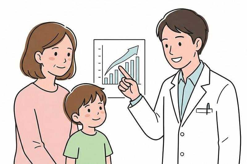 患者さんの背景により個人差が大きいですが、特発性低身長症(ISS)の患者さんでは治療を受けなかった場合と比較して成長ホルモンの治療により年+3~6㎝の伸びが期待できます。GH分泌不全症の患者さんでは上記よりも治療効果が高いことが期待されます。